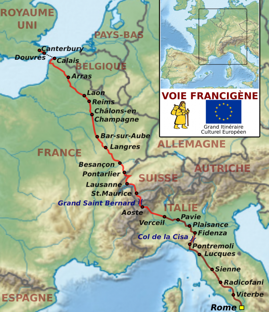 Tel qu’il était élu, l’itinéraire reprenait une ancienne voie de pèlerinage vers Rome, qui a connu son apogée au XIIIème siècle. L’Itinéraire commence à Canterbury pour finir à Rome, en traversant la France et la Suisse. Il reprend le tracé du voyage entrepris par l’archevêque de Canterbury, Sigéric, qui se rendit à Rome en 990 afin d’y rencontrer le pape Jean XV, et qui en laissa la description dans un document qui récapitule ses 80 étapes, lors du voyage de retour.