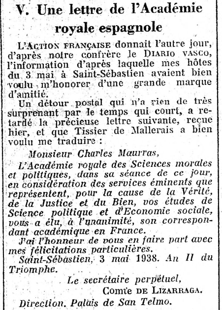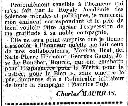 - tandis que le paragraphe V revient sur "la grande marque d'amitié" que l'Académie royale fit à Maurras en l'élisant "à l'unanimité" comme son "correspondant académique en France"...