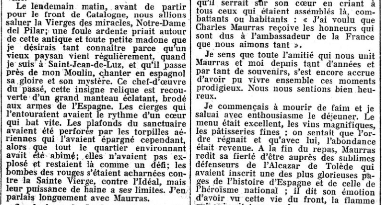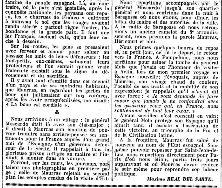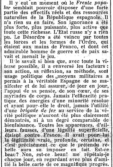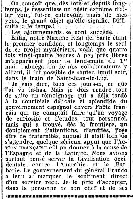 • Enfin, pour tâcher d'être le plus complet possible sur ce voyage qu'il est assez difficile - on l'a vu - de rapporter, signalons deux dernières choses intéressantes au lecteur, s'il veut aller plus loin : dans sa "Politique" des 10 et 14 Mai, Maurras parle du "Movimiento" espagnol, dont Franco fut l' "abanderado" (littéralement : porte-drapeau; ici : chef, meneur...) :