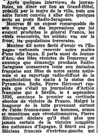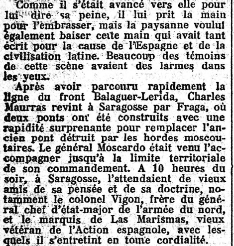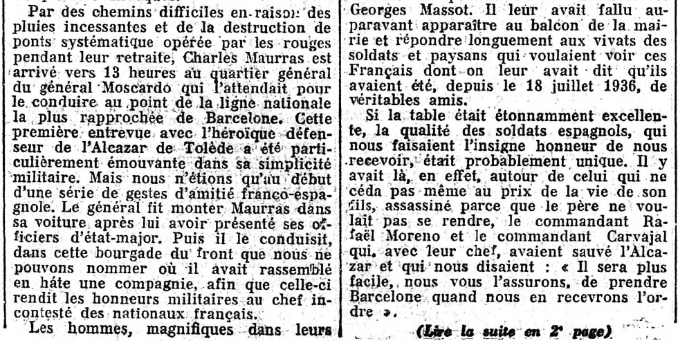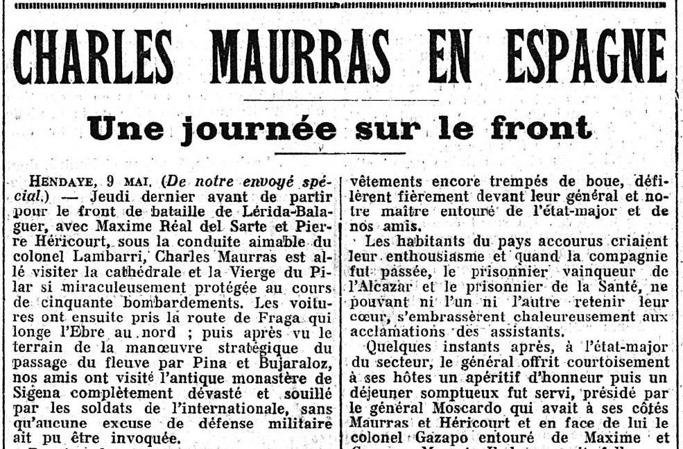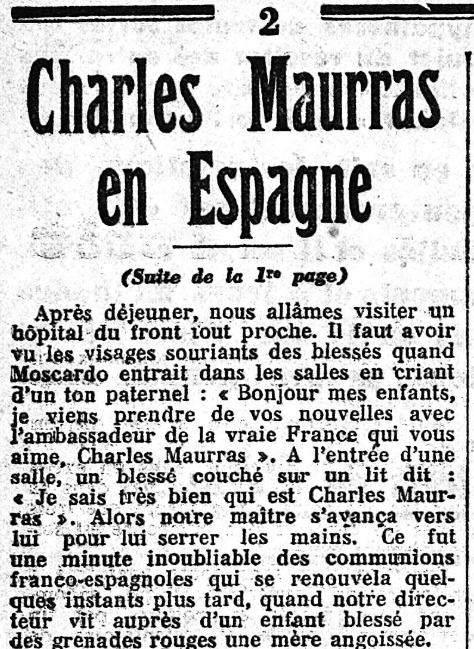 Ce jour-là, le journal ne parle que très peu du voyage de Maurras. Par contre, celui-ci a envoyé sa "Politique", assez longue, qui occupe les deux colonnes centrales du journal, et dans laquelle il évoque son voyage, presqu'incidemment, à propos d'une mauvaise querelle cherchée par La Croix; et, en page trois, un court billet ("Charles Maurras a visité le front de Catalogne") annonce que les nouvelles arrivent mal d'Espagne; où Maurras, toujours accompagné de l'héroïque Général Moscardó, "passa en revue un bataillon d'infanterie" !