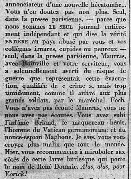 Comme l'a écrit Bainville : qu'on n'aille pas croire que nous nous réjouissions d'avoir eu raison; au contraire, et comme il est triste de voir les choses se passer aussi mal que ce que l'on avait pu déduire des funestes erreurs commises !...