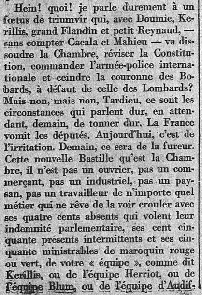 • Bainville, justement, écrit un papier assez court, "Adolphe chez Monsieur Paul", dans lequel il revient sur la façon dont "Adolphe" (Hitler) a "eu la peau" de "Monsieur Paul" (Paul von Hindenburg), finalement, un autre Kerenski...
