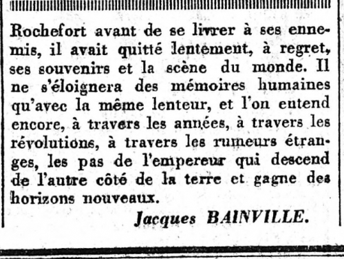 Voici le lien qui y donne accès : la page est intégralement consacrée à "La vie littéraire" et, sur presque les deux tiers supérieur des deux premières colonnes on a les dernières lignes de la dernière page de "ce grand livre", présentées au lecteur par une courte introduction, même pas signée (les dix lignes de conclusion, avec la signature "Jacques Bainville" sont reportées en troisième colonne, au centre) :