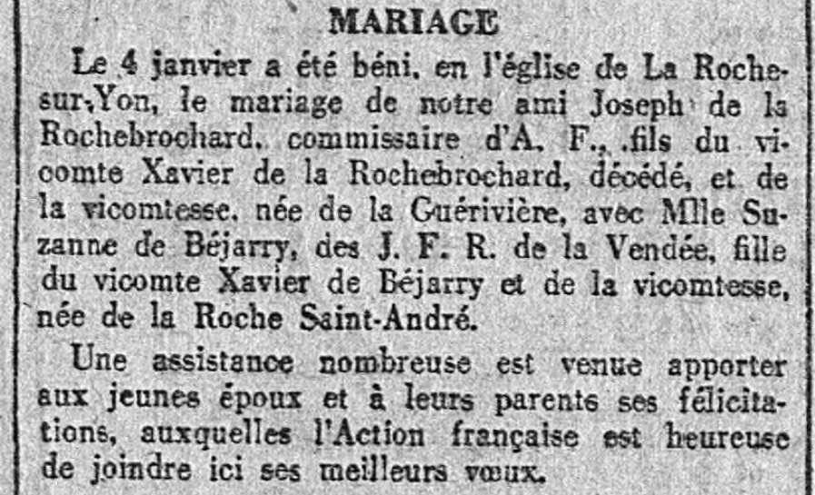 Cet "abbé Magnan" était chanoine, à la paroisse Notre-Dame de l'Assomption, à un jet de pierre de la Campagne que mon grand-père Gustave Delanglade acheta en 1900, lui donnant le beau nom de "Campagne Saint Joseph". C'est lui, le chanoine Magnan, qui insista auprès de mon grand-père afin que celui-ci acceptât le mariage de mon père avec sa fille, Marie-Louise Delanglade. Mon grand-père souhaitait évidemment le meilleur pour ses filles, et "pesait" sa réponse; le chanoine usa alors de deux "arguments massue", qui emportèrent la décision : il parla plusieurs fois, en bien, de ce "jeune homme très catholique" mais aussi "très royaliste", Camelot du Roi et vendeur de l'Action française. Et même, Voyageur de commerce pour la marque Germidor, et donc très souvent en train, et à Paris, ce jeune homme était inscrit sur la liste des vendeurs volontaires de l'église de La Trinité ! Là, Grand-père n'y tint plus et finit par dire "oui" ! Heureusement, sinon je ne serais pas là pour raconter le rôle du chanoine Magnan dans le mariage de mes parents (confidences que je tiens de ma mère...) Dernière chose : le typo parisien du journal ignorait évidemment que le lieu-dit La Gavotte s'écrivait en deux mots, et non attaché (d'ailleurs, dans une information suivante, l'erreur sera corrigée...)