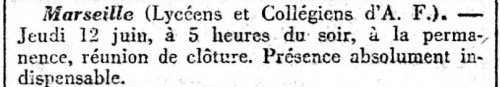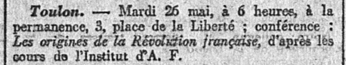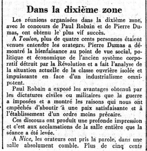Vous trouverez peut-être, au fil des parutions, des noms vous rappelant des souvenirs familiaux : c'est ce qui m'est arrivé en découvrant, au jour du 20 Février 1910 - justement à Toulon - la présence de mon grand oncle paternel dans le Bureau de l'Union Fraternelle de Prévoyance de l'Action française, mais aussi Secrétaire de l'Orphéon toulonnais et, enfin, Secrétaire de la Section de Toulon; et l'annonce du second mariage de mon grand-père, après le décès de ma grand-mère ("Je coutai la vie à ma mère en venant au monde", écrit Chateaubriand : c'est ce qui se passa le 23 Janvier 1906, jour de la naissance de mon père et du décès de ma grand-mère...)... Un autre membre de l'URP a retrouvé dans ces pages l'annonce du mariage de ses grands-parents et la présence de deux de ses oncles dans les six premiers militants/fondateurs de la sous-section de Château-Gombert... Un autre encore (et plusieurs fois) la présence de son oncle, Régis d'Oléon, Maire royaliste de Rognonas et qui participait (voire, les présidait) à tous les Rassemblements royalistes de la région...