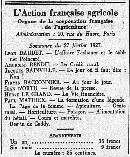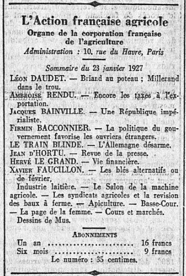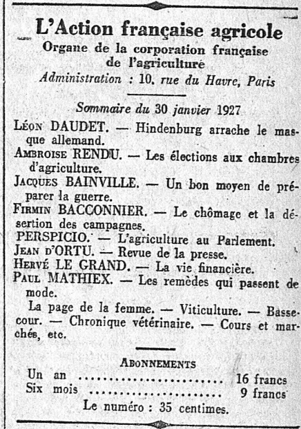 Il n'y a , en réalité, que très peu de changements entre L'Action française du Dimanche et L'Action française agricole : elle paraît toujours le dimanche; on y trouve toujours les deux articles de Daudet et de Bainville, et une grande quantité de conseils pratiques, très précieux et reconnus comme tels, destinés au monde paysan, et dans tous les domaines...