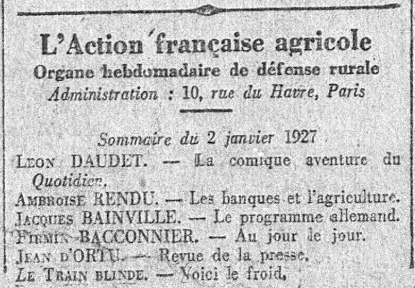 Toujours destiné au monde rural, L'Action française Agricole prend la suite, en fin d'année 1925, de L'Action française du Dimanche, dont le premier numéro était paru le 19 0ctobre 1919, et le dernier en novembre 1925.