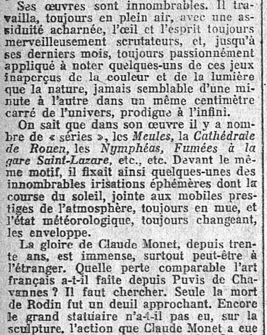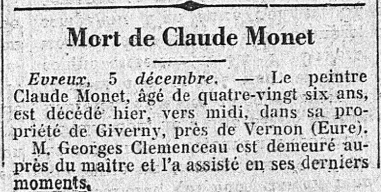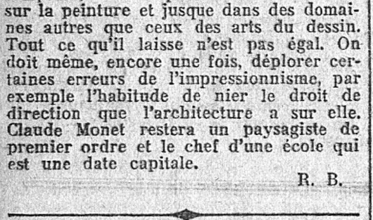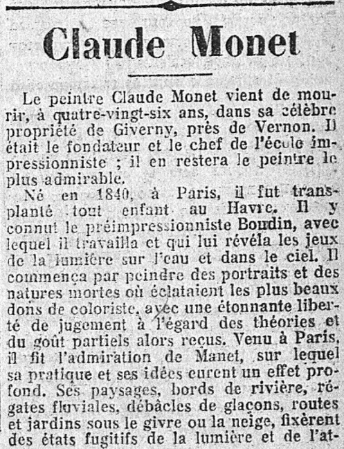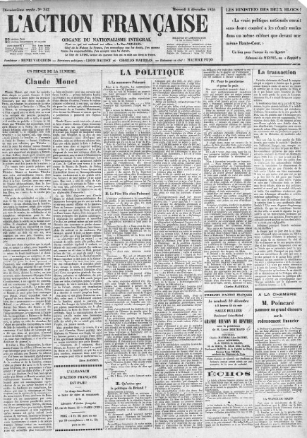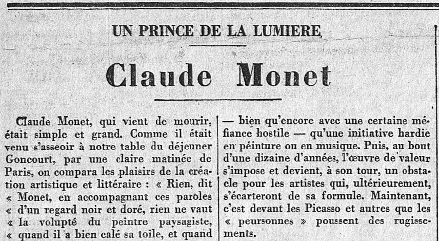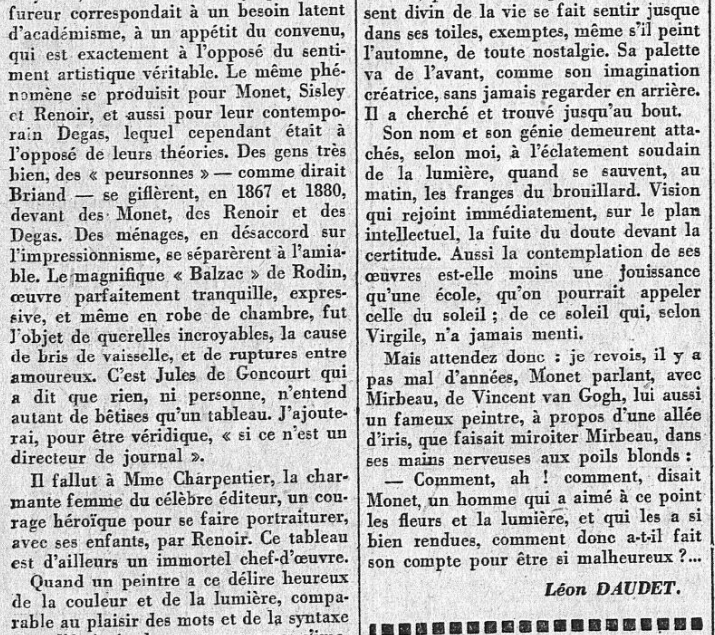 Voici le lien conduisant à la "Une" du Mercredi 8 Décembre 1926, dans laquelle Léon Daudet dit son admiration pour Claude Monet, qui vient de mourir : Claude Monet, ce "prince de la lumière", qui "ajoute à l'univers..."