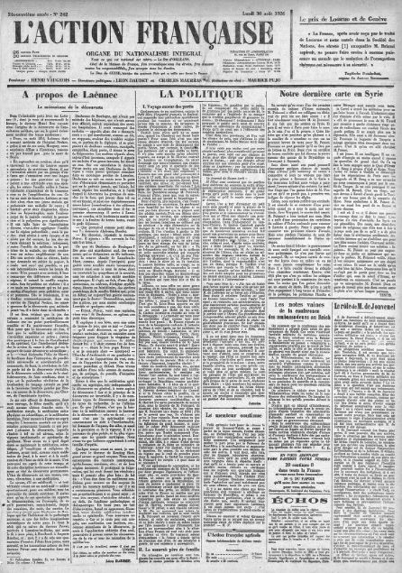 Grandes "Une" de L'Action française : (3/3) Pour le centenaire de Laënnec, par Léon Daudet...