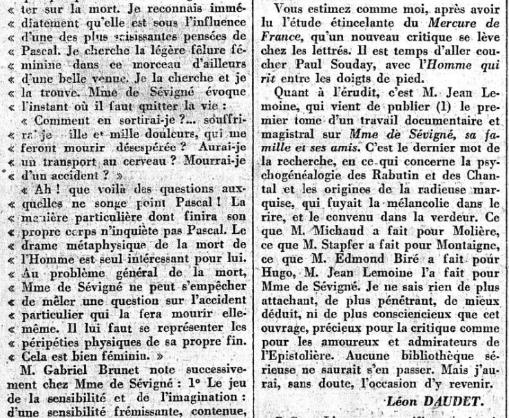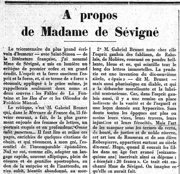 Nous sommes en février 1926 : en cette période du tri-centenaire de la Marquise, Gabriel Brunet, dans Le Mercure de France du 15 Février, vient de donner "...un portrait exquis et en profondeur" de celle que Daudet appelle "la plus gravement enjouée des femmes de lettres".