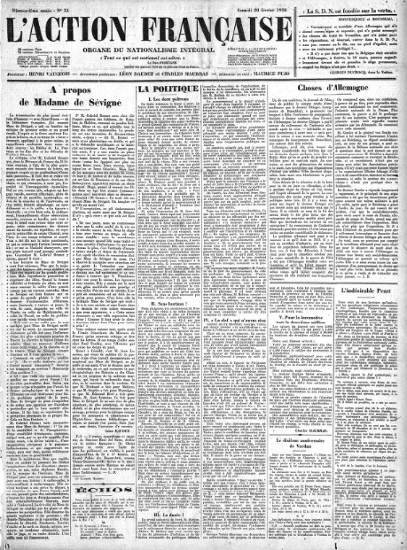 Grandes "Une" de L'Action française : "À propos de la Marquise de Sévigné", par Léon Daudet...