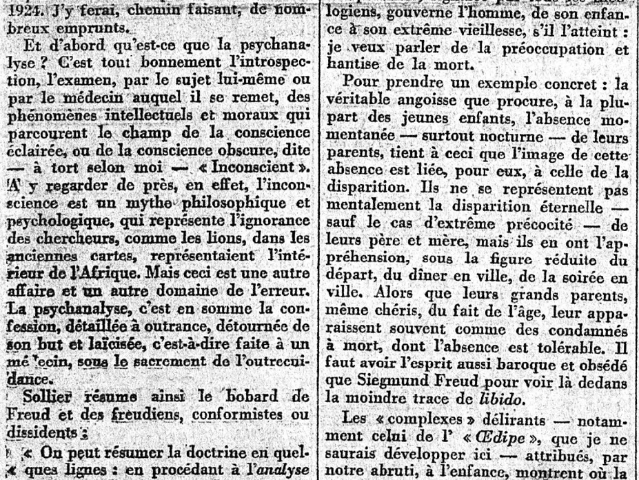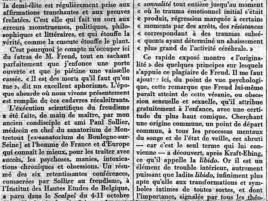 • d'abord le Jeudi 4 Février, où Daudet explique le pourquoi de son opposition au "freudisme" et à la "psychanalyse"; l'article est un peu plus long que d'habitude puisque, cette fois, il occupe l'intégralité des deux premières colonnes...