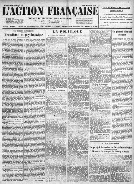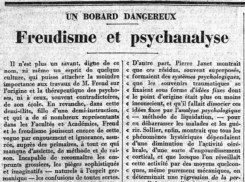Grandes "Une" de L'Action française : "Un bobard dangereux : Freudisme et psychanalyse", par Léon Daudet...