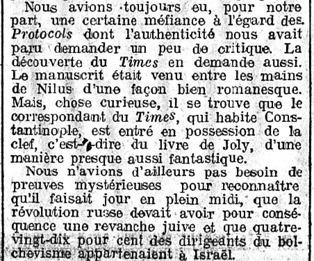 En France ce n'est qu'en 1920 que le texte fut publié : il n'aura pas fallu longtemps à L'Action française - ici, sous la plume de Bainville - pour "être les premiers dans la presse française" à dénoncer le faux et le plagiat, dès 1921 :