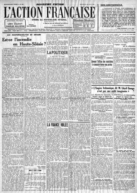 Ce jour-là, elle est, du reste très courte, et ne compte que deux paragraphes : le premier, consacré à la Haute Silésie et le second à "L'origine des Protocols" : voici le lien conduisant à cette "Une" du Mercredi 19 Août 1921 et au court mais très clair article de Bainville :