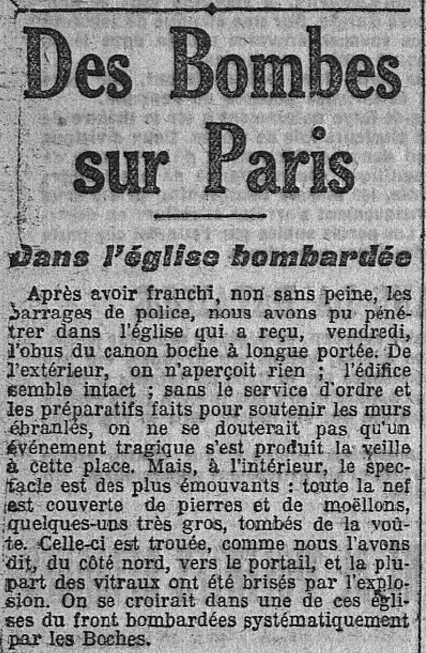 Le bombardement de l'église Saint-Gervais eut lieu le 29 mars 1918 : c'était le Vendredi Saint ! L'église, bondée pour les vêpres, fut dévastée; on dénombra 75 morts !