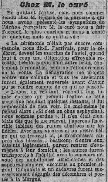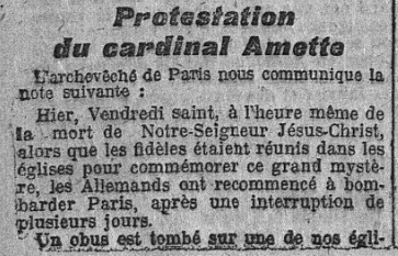 Grandes "Une" de L'Action française : Sacrilège ! Le Vendredi saint 1918, les canons boches tirent sur l'église Saint Gervais : 75 morts !...