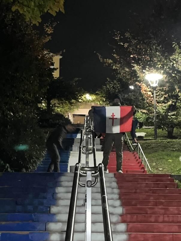 "LYON - Les royalistes repeignent la Croix-Rousse aux couleurs de la France. Le drapeau palestinien peint sur les escaliers de la Grande côte a été remplacé par une oriflamme française. Une action signée @AF__Lyon."