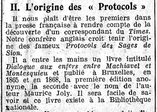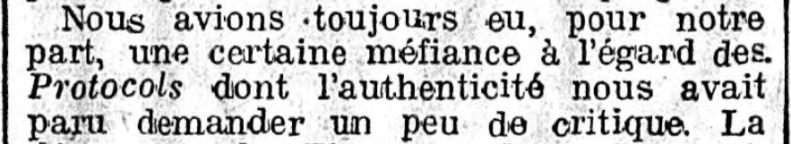 • Mardi : ... Paru en France en 1920, le vulgaire faux et "plagiat" des "Protocols des Sages de Sion" est dénoncé comme tel par Bainville, dès 1921... Bainville jubile, manifestement, de voir l'Action française être la première, dans al presse nationale, à dénoncer l'imposture...