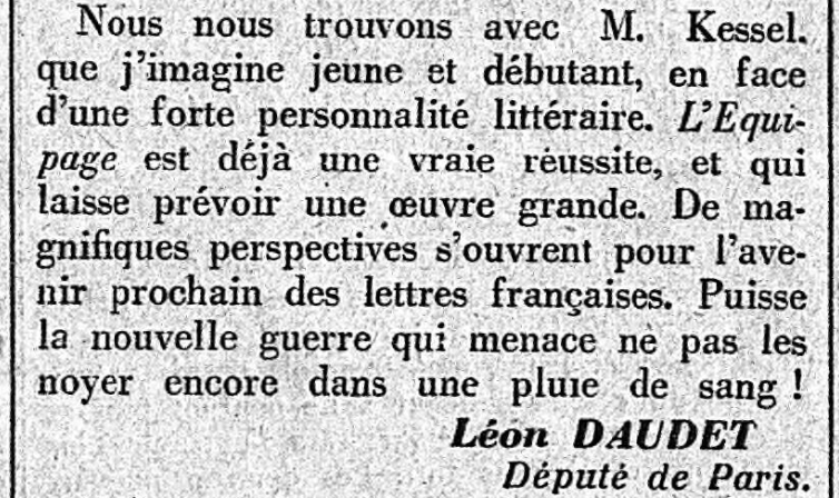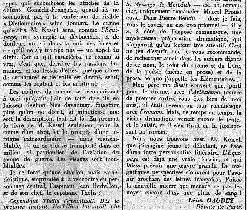 Né le 10 Février 1898, Joseph Kessel, qui vient d'écrire son second ouvrage, "L'Équipage" (un "maître-livre", dit Daudet), a à peine vingt cinq ans et demi lorsque Léon Daudet le remarque, sent le grand écrivain et le révèle au public, contribuant ainsi à "lançer" ainsi - comme il le fit pour tant d'autres ! - sa brillante cartière (Kessel sera l'auteur de quatre-vingts ouvrages !)