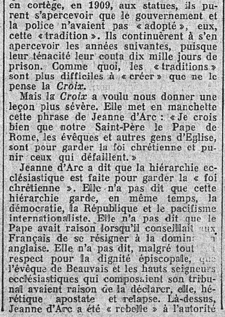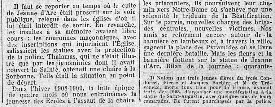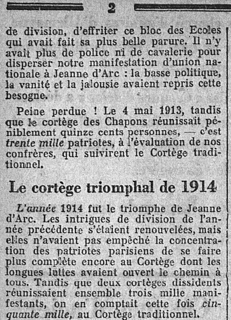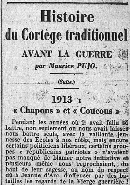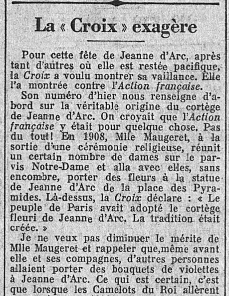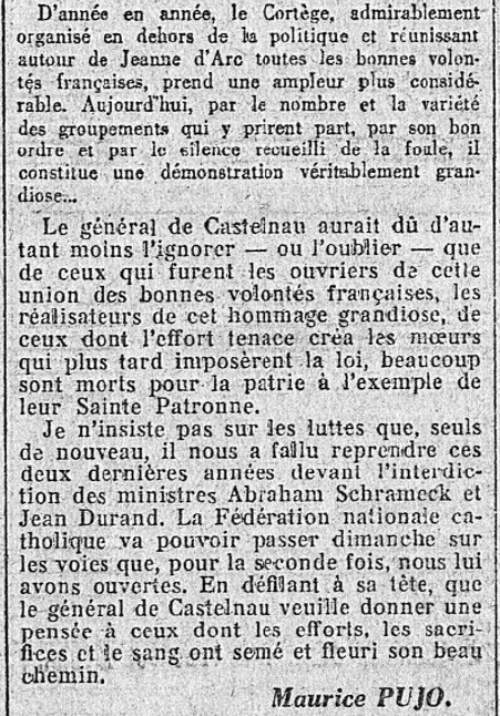 C'est en plein milieu du très pénible et douloureux moment que traversa l'Action française - à cause des iniques et infondées "sanctions vaticanes" du pape d'enfer germanophile Pie XI - que Maurice Pujo entreprend d'établir la vérité sur les origines du Cortège de Jeanne d'Arc.