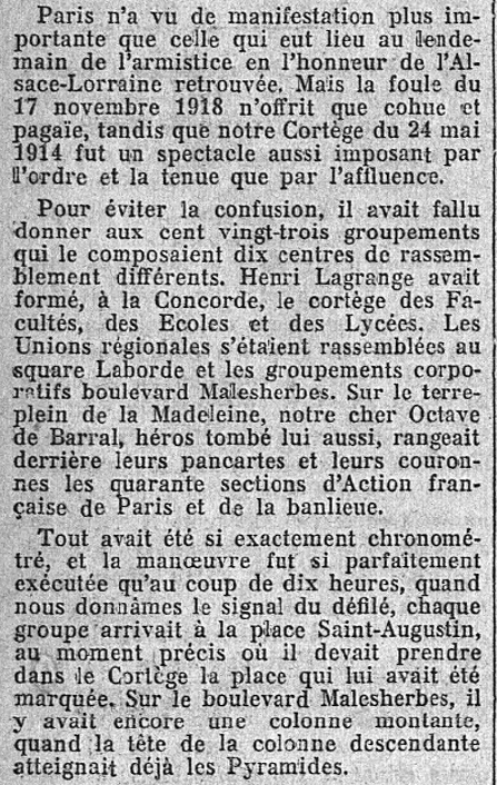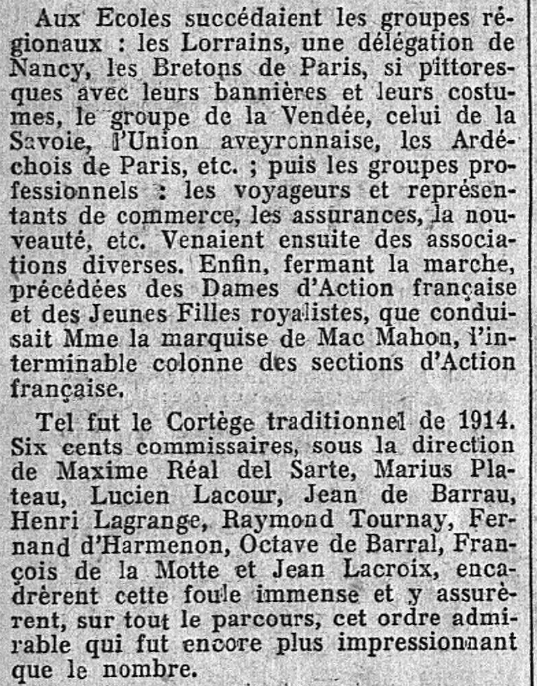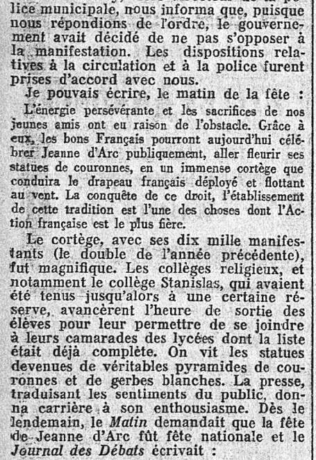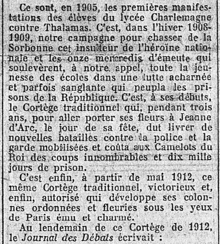 Il le fait en expliquant simplement, mais clairement, le "comment" et le pourquoi" de l'acceptation et de l'officialisation par la république - en tant que Fête nationale - de ce qui, au départ, était seulement une manifestation de l'Action française, durement combattue et réprimée par le Régime : de ce combat féroce, l'Action française et les Camelots sortirent victorieux.