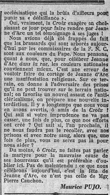 en "Une" du numéro du Dimanche 8 Mai 1927 (partie inférieure de la colonne cinq, et supérieure de la sixième et dernière) : le récit est terminé, place à la polémique, en réponse à des stupidités de mauvaise foi publiées par La Croix, tendant à discréditer le rôle de l'Action française, et "bavant" misérablement sur elle. La Croix reçoit, de la part de Pujo -excellent ! - la volée d ebois vert qu'elle mérite...