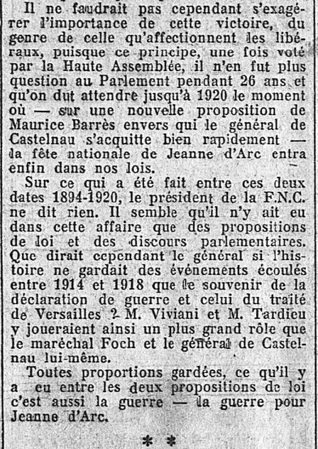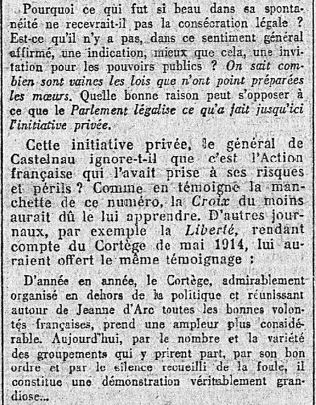 On va voir, grâce à Pujo, comment le régime fut contraint d'admettre comme Fête nationale la célébration de "la Sainte de la Patrie", que nous étions seuls, au début, à proposer aux Français...