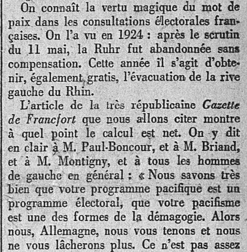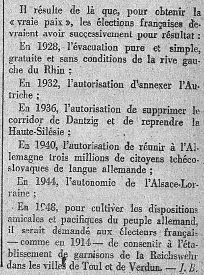 Dès le début, l'Action française, et les autres patriotes lucides (notamment dans l'Armée) dénoncèrent la folie du non démembrement; puis, l'une après l'autre, l'abandon par la république anti-France des rares clauses positives du funeste Traité de Versailles : évacuation par l'armée française de la rive gauche du Rhin, abandon de nos amis séparatistes rhénans (le docteur Dorten...) que la république laissa massacrer à Pirmasens, absence de réaction face au ré-armement allemand, à la re-militarisation de la Rhénanie...