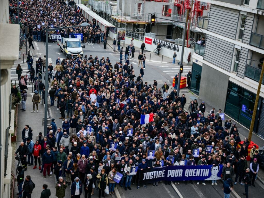 "La #marche à #Lyon en mémoire de #Quentin, 23 ans, lynché pour ses opinions, s’est déroulée sans troubles à l’ordre public, dans le calme. Pendant que certains médias de gauche ou ultra politiquement corrects tentent, comme toujours, le reductio ad hitlerum en la caricaturant en réunion “néo-nazie” en pointant quelques individus isolés, les vraies scènes d’intimidation viennent des contre-manifestations antifascistes, comme cela a été le cas à #Rennes ce matin, où leurs participants se réjouissent publiquement d’une mort. La banalisation de l’hyperviolence continue et preuve est faite que la gauche radicale n’a aucune intention de faire son mea culpa quant à ses discours brutaux qui incitent à la violence."