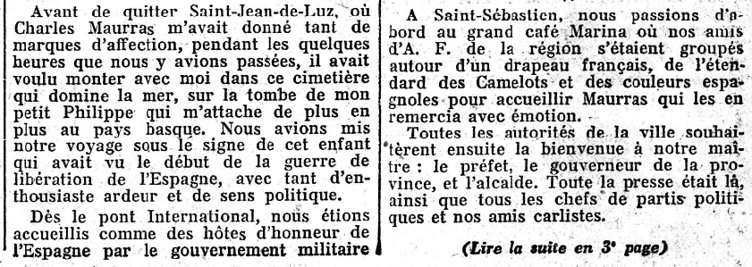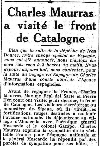 Ce jour-là, le journal ne parle que très peu du voyage de Maurras. Par contre, celui-ci a envoyé sa "Politique", assez longue, qui occupe les deux colonnes centrales du journal, et dans laquelle il évoque son voyage, presqu'incidemment, à propos d'une mauvaise querelle cherchée par La Croix; et, en page trois, un court billet ("Charles Maurras a visité le front de Catalogne") annonce que les nouvelles arrivent mal d'Espagne; où Maurras, toujours accompagné de l'héroïque Général Moscardó, "passa en revue un bataillon d'infanterie" !
