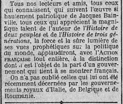 Oui, comme le dit ce court "écho" - dont le style fait irrésistiblement penser que Maurras en est le rédacteur - "...Tous nos lecteurs et amis, tous ceux qui connaissent, qui suivent, l'oeuvre si hautement patriotique de Jacques Bainville, tous ceux qui apprécient le magnifique talent de l'auteur de l'Histoire de deux peuples et de l'Histoire de trois générations, la force et la sûre lumière de ses vues prophétiques sur la politique du monde, applaudiront, avec L'Action française tout entière, à la distinction dont il est l'objet de la part d'un gouvernement qui tient à se montrer français..."