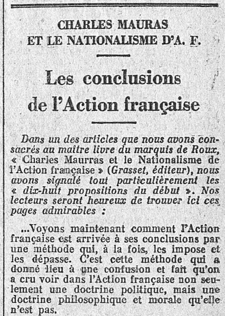 Autour de Bainville; de Daudet; de Maurras; de Maurras (mais aussi Daudet et Pujo) et de Gaulle; autour de la Victoire de "14/18", perdue en 1919 par le calamiteux Traité de Versailles; autour de Jeanne d'Arc et de ses Cortèges; autour des Rassemblements royalistes; autour de l'Union Royaliste Provençale; autour de la terrible inondation de 1910 à Paris; autour de la Croisière du Campana, en 34; autour des "sanctions vaticanes" contre l'AF et de leur levée; autour de la Guerre d'Espagne...