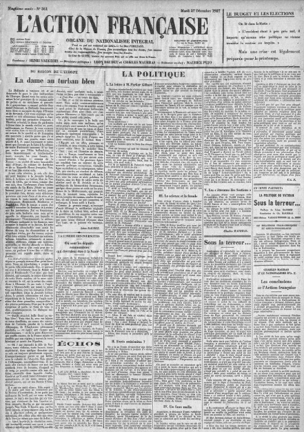 • Grandes "Une" de L'Action française : la vie du mouvement, vue de l'intérieur (1/2) : informations diverses et variées, joies et peines touchant la grande famille d'Action française...(2/4 : de 1921 à 1927)