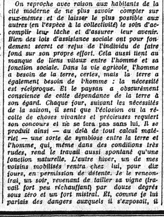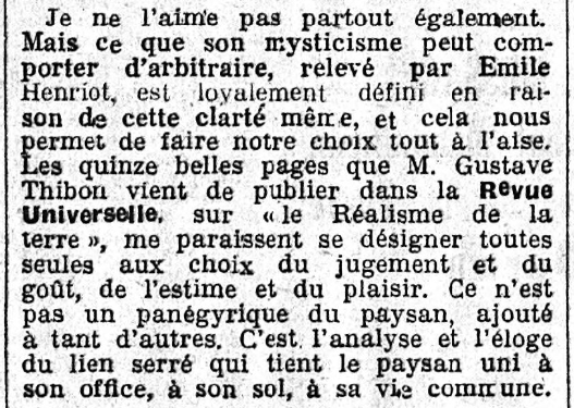 Il le fait dans sa "Politique", divisée en cinq paragraphes dont les trois premiers sont en "Une" et les deux derniers (avec la fin du troisième) sont en page 2 : l'enthousiasme éclate dès la première ligne du cinquième et dernier (et long !) paragraphe de cette "Politique" du jour, intégralement consacré à Thibon et intitulé "V. Le réalisme de la terre" :