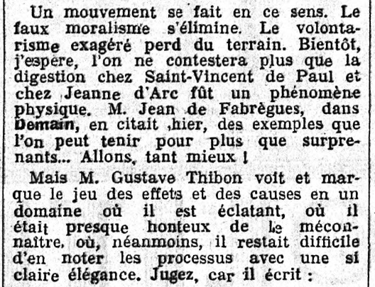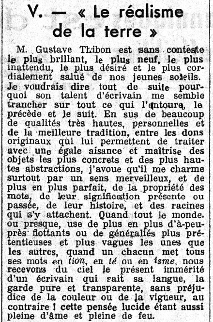 "Gustave Thibon est sans conteste le plus brillant, le plus neuf, le plus inattendu, le plus désiré et le plus cordialement salué de nos jeunes soleils..."