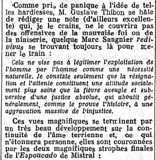 C'est Thierry Maulnier qui "tient" la Revue de Presse, qui occupe un peu moins du tiers des six colonnes de la page 2, dans laquelle Maurras parle de Thibon.