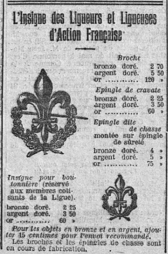 (Ce deuxième volet de cette "vie de l'Action française, vue de l'intérieur", est "en construction" : il concerne l'invention par L'AF de la Revue de Presse, les Congrès, les Almanachs de L'Action française, le nombre d'abonnés au journal, la structuration du mouvement en onze zones sur tout le territoire métropolitain (la onzième zone étant : l'Algérie !), les insignes du mouvement et d'autre sujets encore... Il est publié dès maintenant, et sera augmenté au fur et à mesure de l'avancée de notre lecture de la collection complète du quotidien... )
