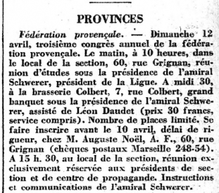 Vous trouverez peut-être, au fil des parutions, des noms vous rappelant des souvenirs familiaux : c'est ce qui m'est arrivé en découvrant, au jour du 20 Février 1910 - justement à Toulon - la présence de mon grand oncle paternel dans le Bureau de l'Union Fraternelle de Prévoyance de l'Action française, mais aussi Secrétaire de l'Orphéon toulonnais et, enfin, Secrétaire de la section de Toulon; et l'annonce du second mariage de mon grand-père, après le décès de ma grand-mère ("Je coutai la vie à ma mère en venant au monde", écrit Chateaubriand : c'est ce qui se passa le 23 Janvier 1906, jour de la naissance de mon père et du décès de ma grand-mère...)... Un autre membre de l'URP a retrouvé dans ces pages l'annonce du mariage de ses grands-parents et la présence de deux de ses oncles dans les six premiers militants/fondateurs de la sous-section de Château-Gombert... Un autre encore (et plusieurs fois) la présence de son oncle, Régis d'Oléon, Maire royaliste de Rognonas et qui participait (voire, les présidait) à tous les Rassemblements royalistes de la région...